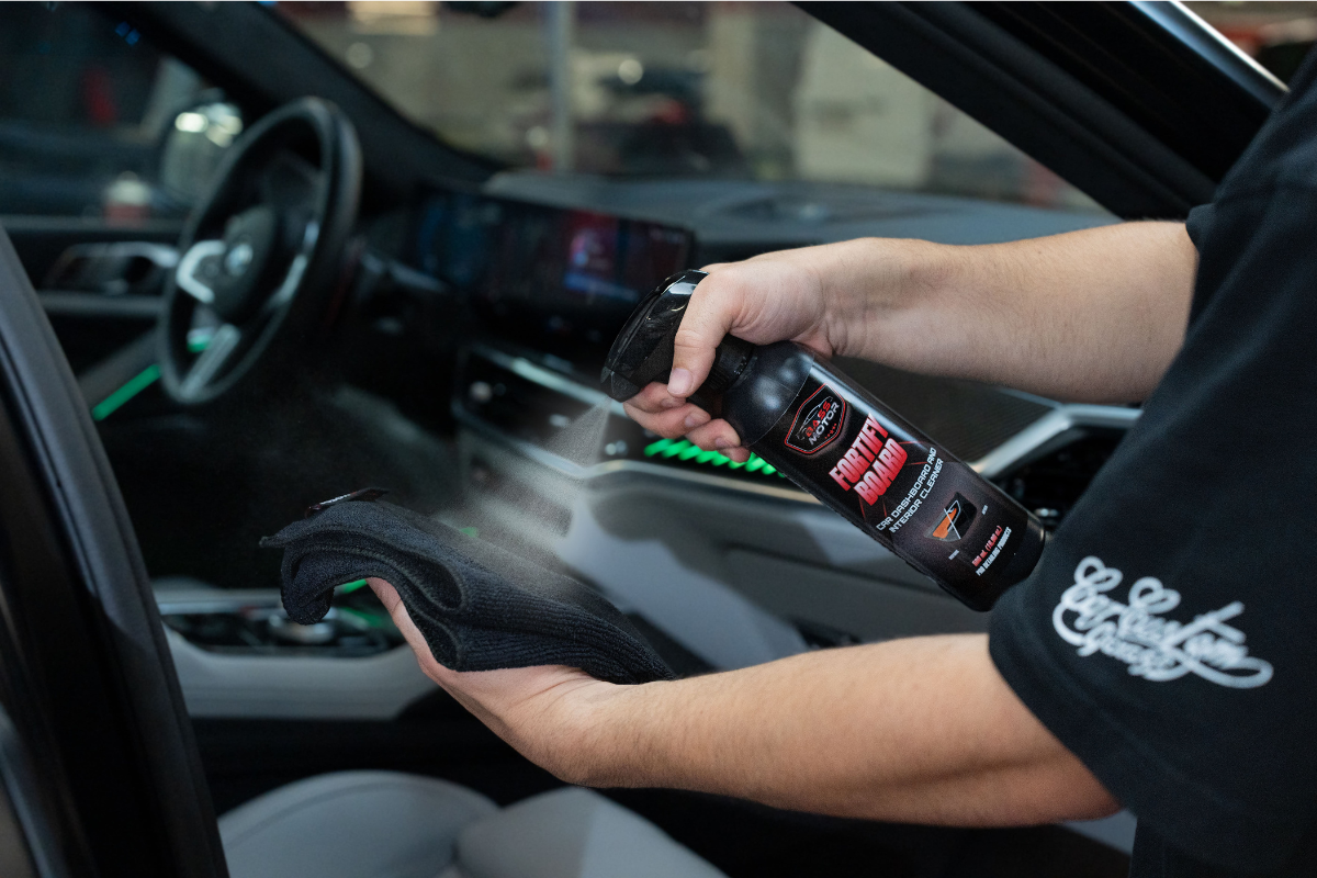 En el interior, limpia y finaliza los plásticos con FORTIFY BOARD usando una bayeta. Termina con GLASS ARMOR en los cristales y un toque de Pure Air en alfombrillas y filtro.