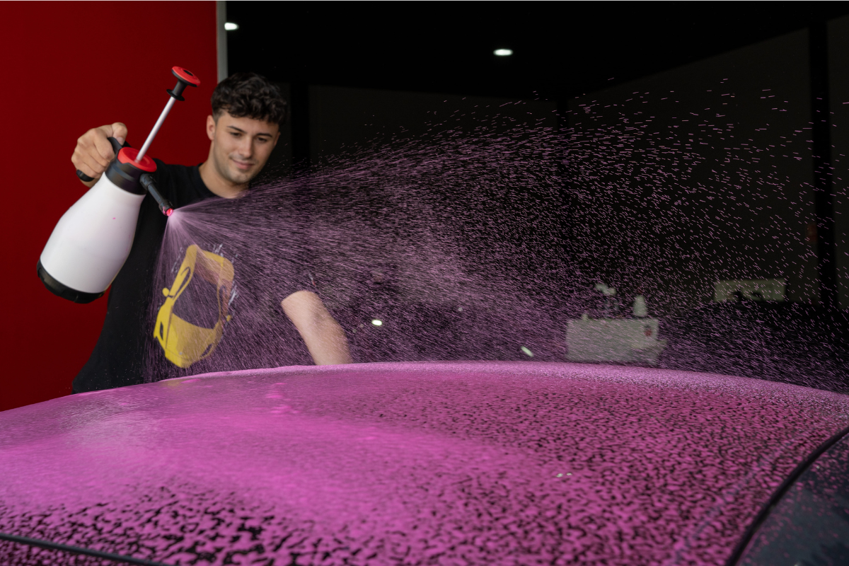 1. Prelavado SNOW: Aplica la espuma por todo el exterior del coche. Déjala actuar 1–2 minutos y aclara.
